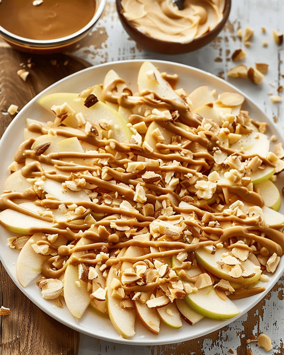 Apple Nachos with Peanut Butter are a fun, no-bake snack that layers crisp apple slices with drizzled peanut butter and a variety of sweet and crunchy toppings. Perfect for a quick and healthy treat for kids and adults alike.