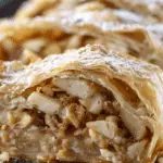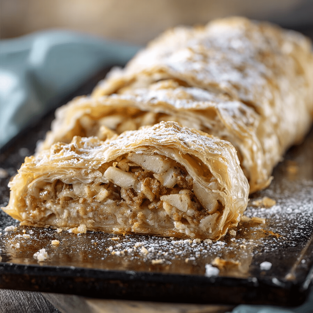 This Apple Strudel recipe features flaky pastry wrapped around a sweet cinnamon-spiced apple filling with raisins and buttery toasted breadcrumbs. Perfect for holidays or cozy gatherings, this classic apple strudel delivers bakery-style flavor with tender apples and crisp, golden layers.