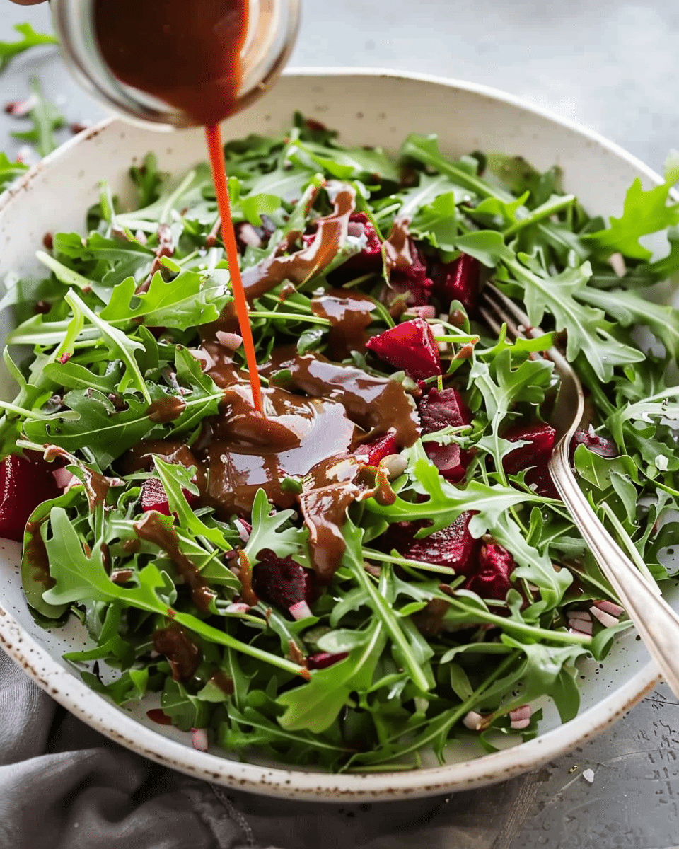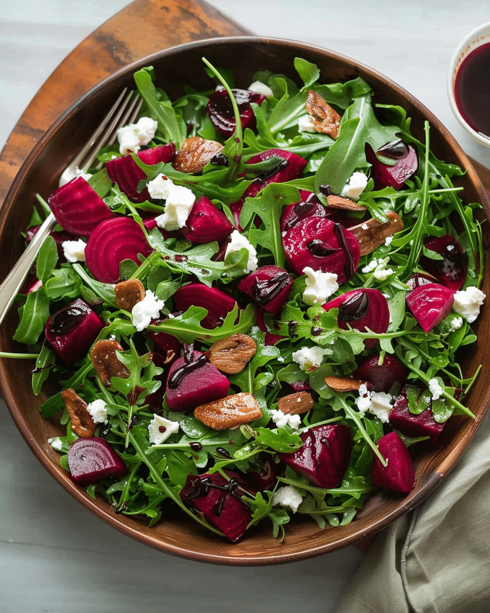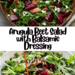 Arugula Beet Salad with Balsamic Dressing is a vibrant, flavorful salad featuring peppery arugula, sweet roasted beets, creamy goat cheese, crunchy toasted nuts, and a tangy homemade balsamic vinaigrette. Perfect as a side or light main dish.