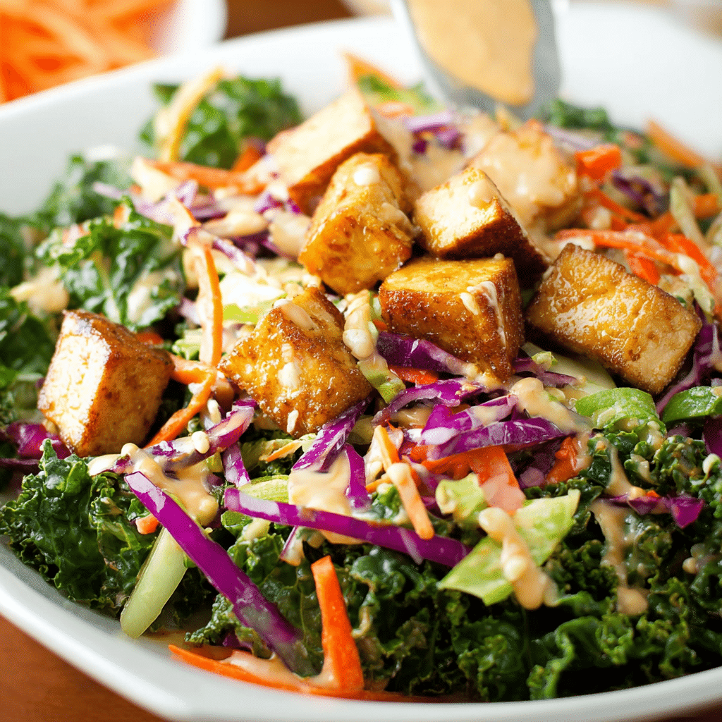 Massaging kale improves texture and reduces bitterness.For a lighter option, bake tofu instead of pan-frying.Keep dressing separate if storing for meal prep.Add noodles or rice to turn this into a more filling bowl.