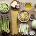 (Tip: You’ll find the full list of ingredients and measurements in the recipe card below.) pasta (spaghetti, penne, or your choice) leeks, cleaned and sliced asparagus, trimmed and cut into pieces garlic, minced olive oil butter parmesan cheese lemon juice or zest salt black pepper optional: crushed red pepper flakes optional: fresh herbs (parsley or basil)