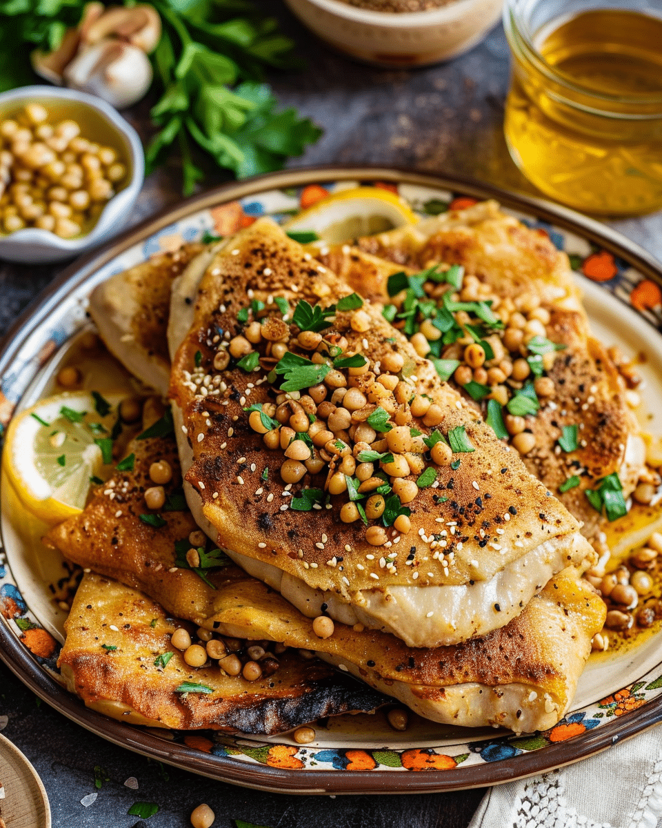 - Fluff the maftoul and serve topped with chicken, garnished with parsley, lemon wedges, and caramelized onions if desired.