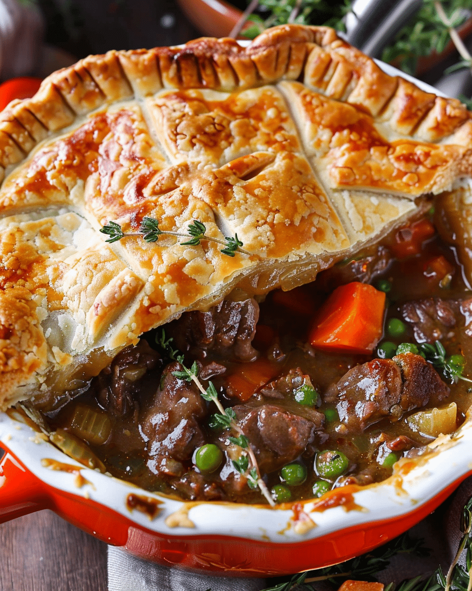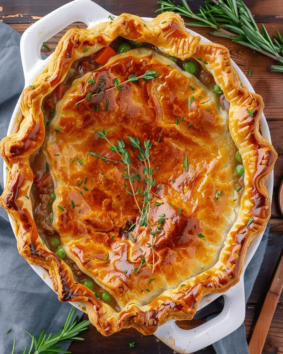 Use puff pastry instead of pie crust for a flakier topping.Add sautéed mushrooms for an earthy flavor boost.For individual servings, bake in ramekins.Great for using up leftover roast or beef stew.Let filling cool slightly before topping with crust to prevent sogginess.