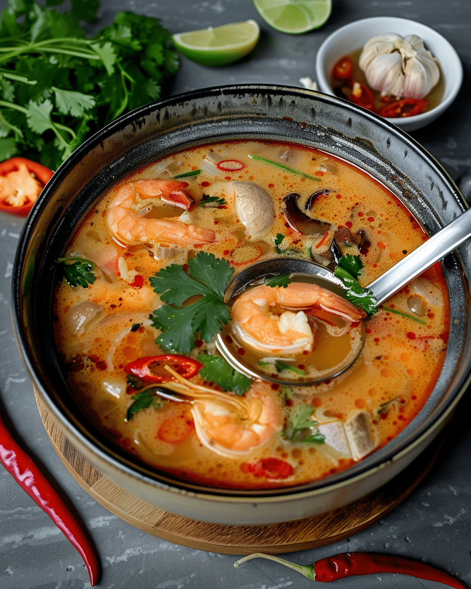 This version of Tom Yum Soup captures the bright, bold, and harmonious balance of sourness, heat, and umami that makes it beloved. With core aromatics, flexible protein choices, and room for adjustment, it’s a recipe you can adapt to your ingredients and spice tolerance. Let me know if you want a full printable recipe card with exact measurements (in grams or cups) or a vegetarian version!