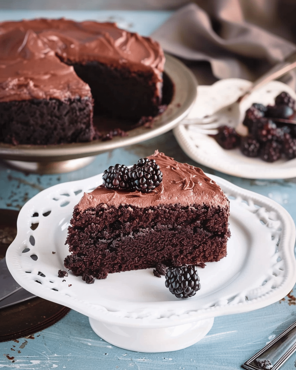 Chocolate buttercream, ganache, or a rich chocolate frosting complement the cake well. The cake’s deep chocolate flavor pairs nicely with a not-too-sweet frosting.