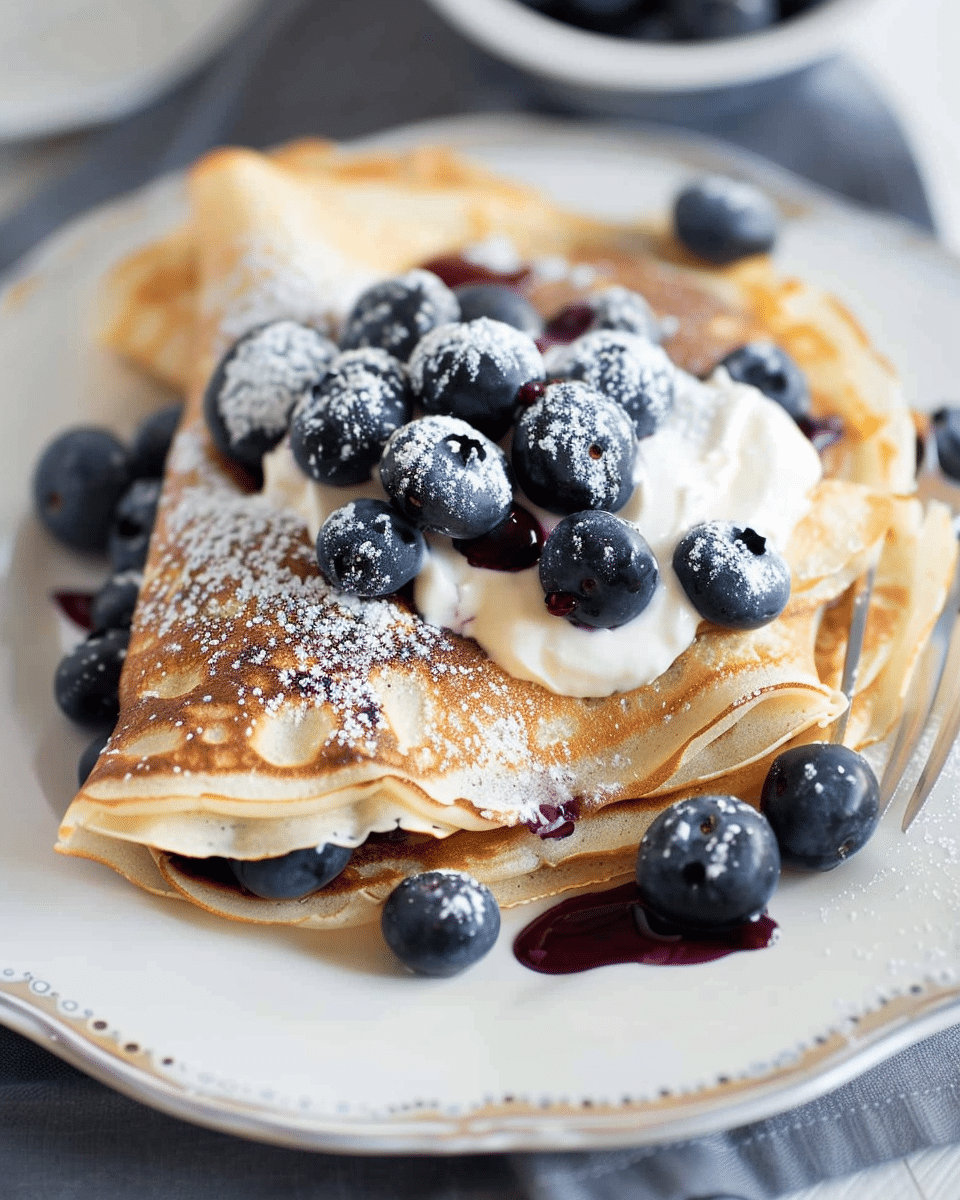 Fill each crepe with blueberry filling, fold or roll, and top with powdered sugar, whipped cream, or syrup as desired.