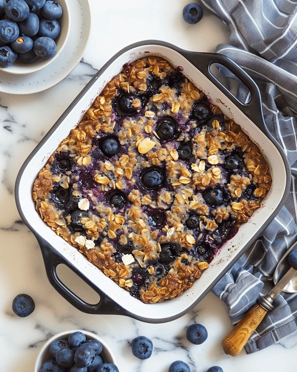 Peach Oatmeal Bake: Swap blueberries for fresh or frozen peaches, and add a pinch of nutmeg to enhance the flavor.
