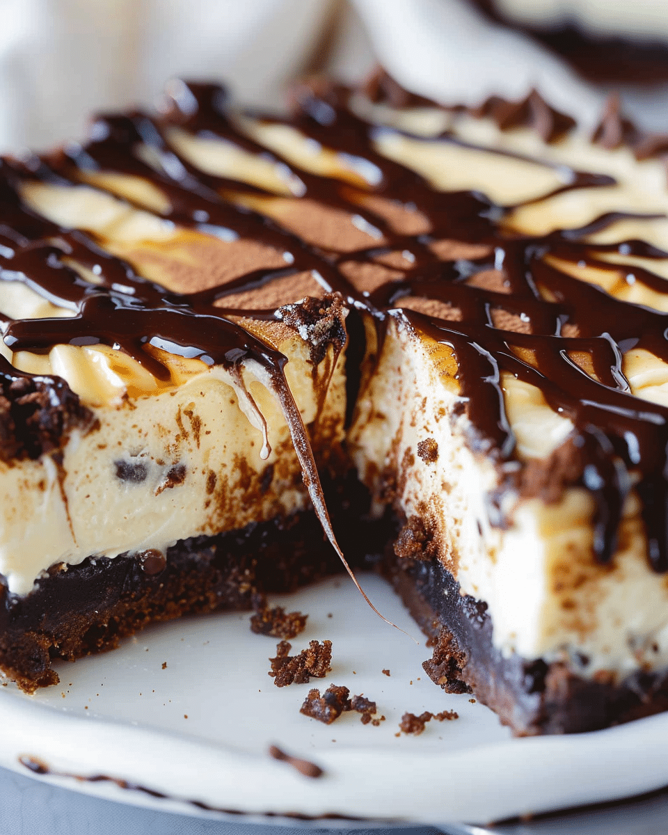 Use a boxed brownie mix for an easy shortcut.Swirl reserved brownie batter into the cheesecake for a marbled look.Add chocolate chips, nuts, or Oreos for extra texture.Top with whipped cream, chocolate ganache, or fresh berries for serving.Best made a day ahead to allow cheesecake to fully set.