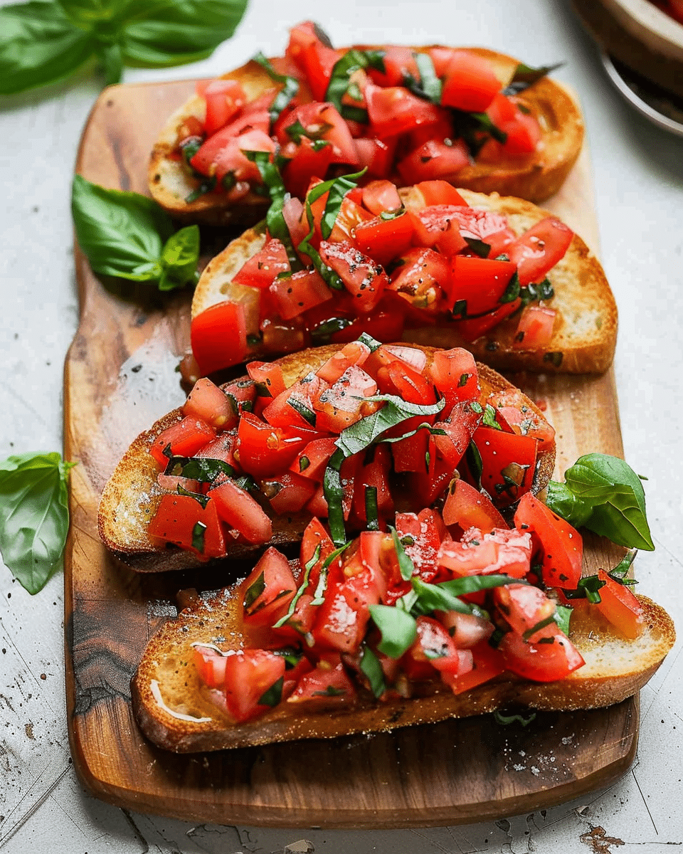 Bruschetta is a classic Italian appetizer that combines fresh tomatoes, garlic, basil, and olive oil on crispy toasted bread for a light, flavorful, and refreshing bite.