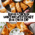 Buffalo Chicken Wontons with Yogurt Blue Cheese Dip are crispy, golden wonton wrappers filled with spicy buffalo chicken and paired with a tangy, creamy yogurt-based blue cheese dip. A perfect party appetizer or game-day snack.