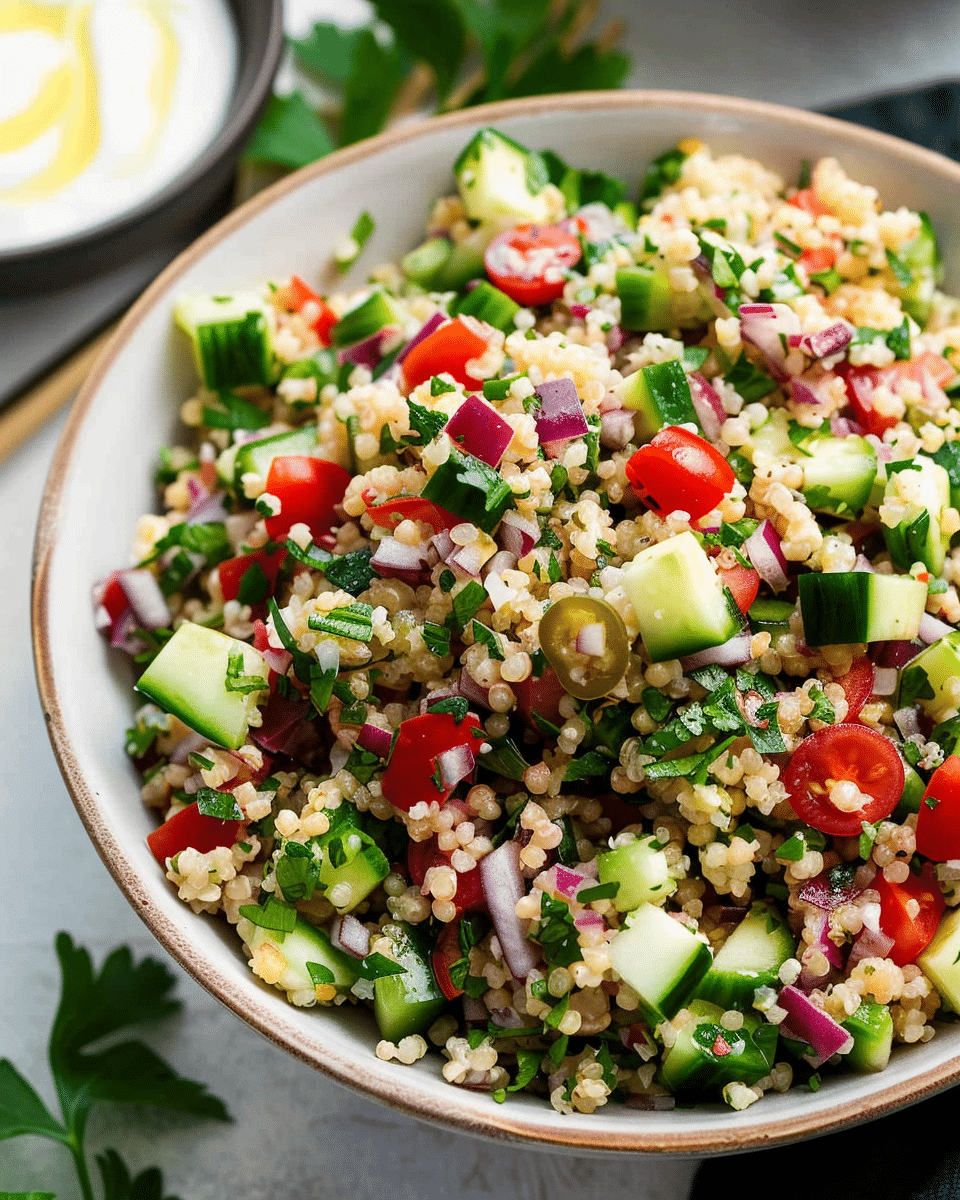 Use fine bulgur for quicker soaking; coarse bulgur may need extra time or hot water.Make it ahead—flavors improve after a few hours or overnight.Refresh leftovers with a splash of lemon juice or olive oil before serving.Not suitable for freezing due to the texture of fresh vegetables and herbs.Add grilled chicken, tofu, or chickpeas to make it a complete meal.