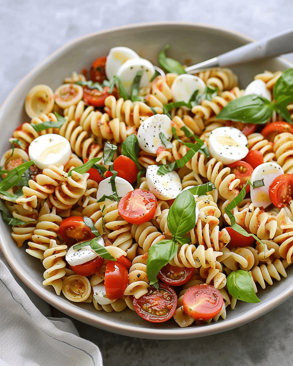 Caprese pasta salad is a fresh, easy-to-make dish that brings together bright Italian flavors in a crowd-pleasing way. With juicy tomatoes, creamy mozzarella, fragrant basil, and a light dressing, it’s a versatile and delicious option for any occasion. Whether served as a side or a main dish, it’s sure to be a hit every time.