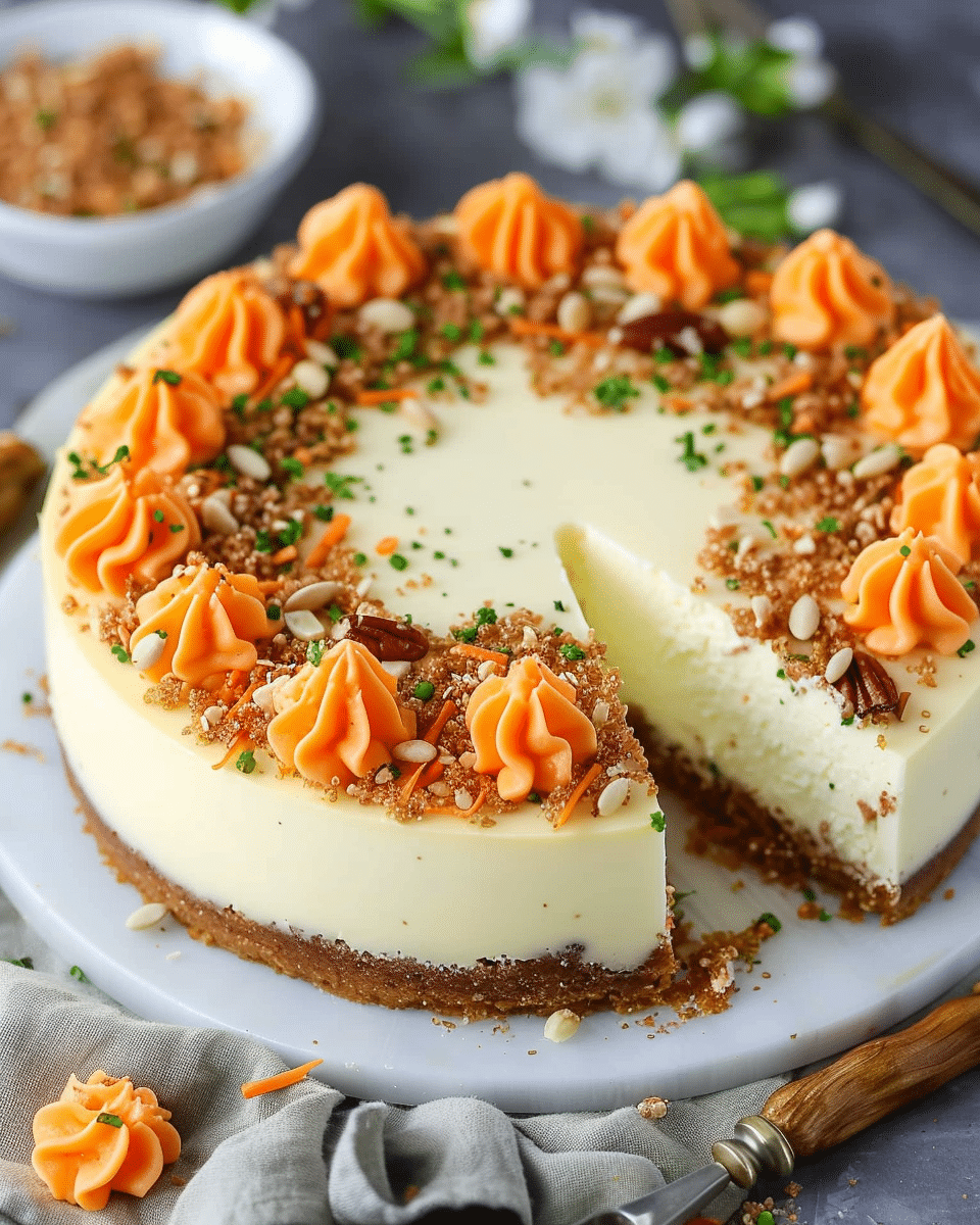 Freshly grated carrots work best for moisture and flavor.Chilling overnight improves texture and flavor.To prevent cheesecake cracks, avoid overmixing and cool slowly before refrigerating.Can be made gluten-free by using a gluten-free flour blend.