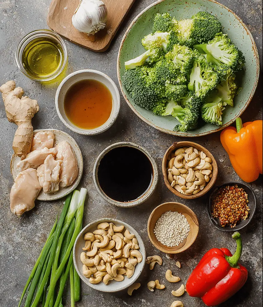chicken breast or thighs cashews bell peppers broccoli carrots onion garlic ginger soy sauce oyster sauce hoisin sauce chicken broth cornstarch sesame oil vegetable oil brown sugar green onions