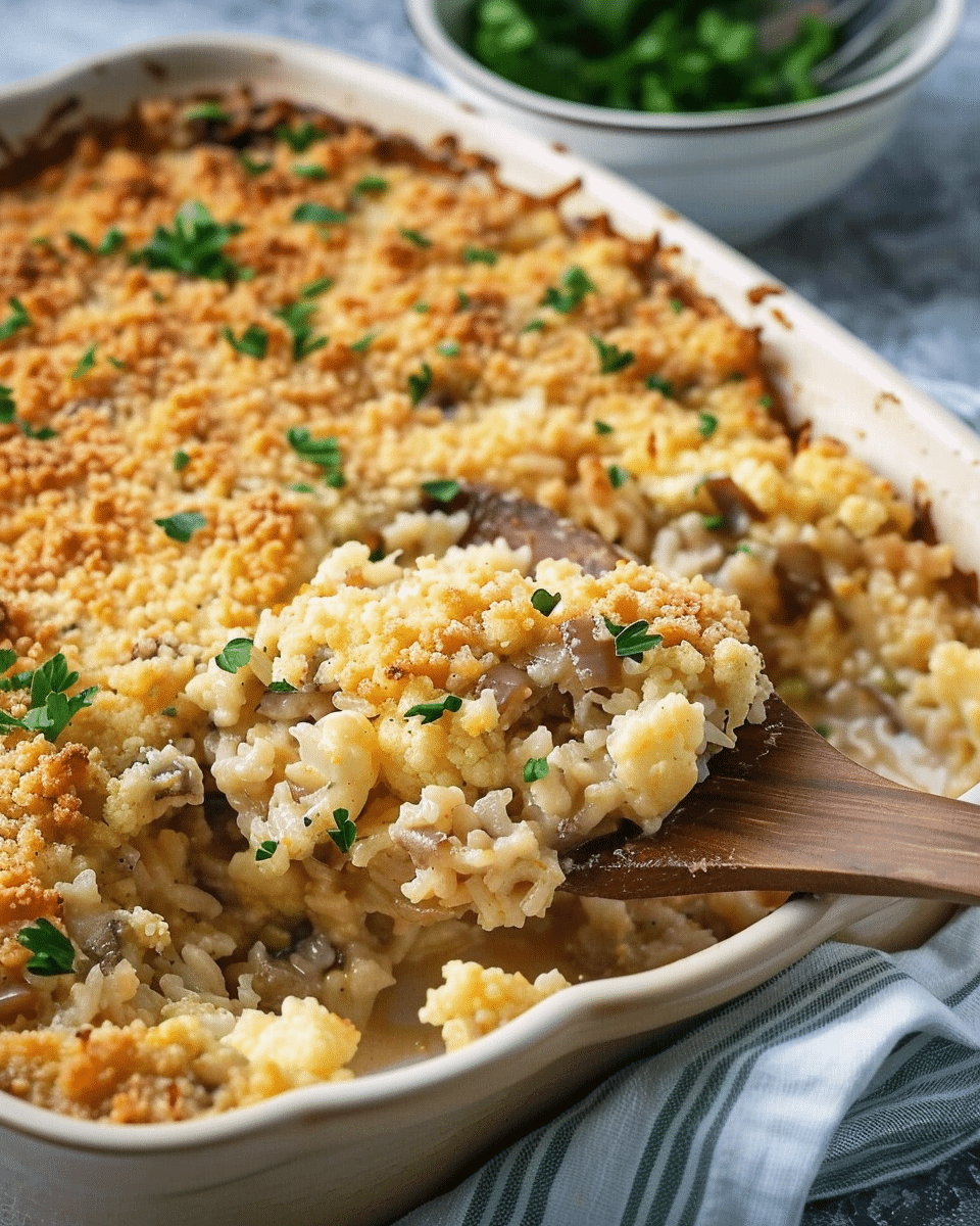 Prepare the topping: In a small bowl, combine the breadcrumbs with the melted butter, then sprinkle the mixture evenly over the top of the casserole for a crunchy, golden topping.