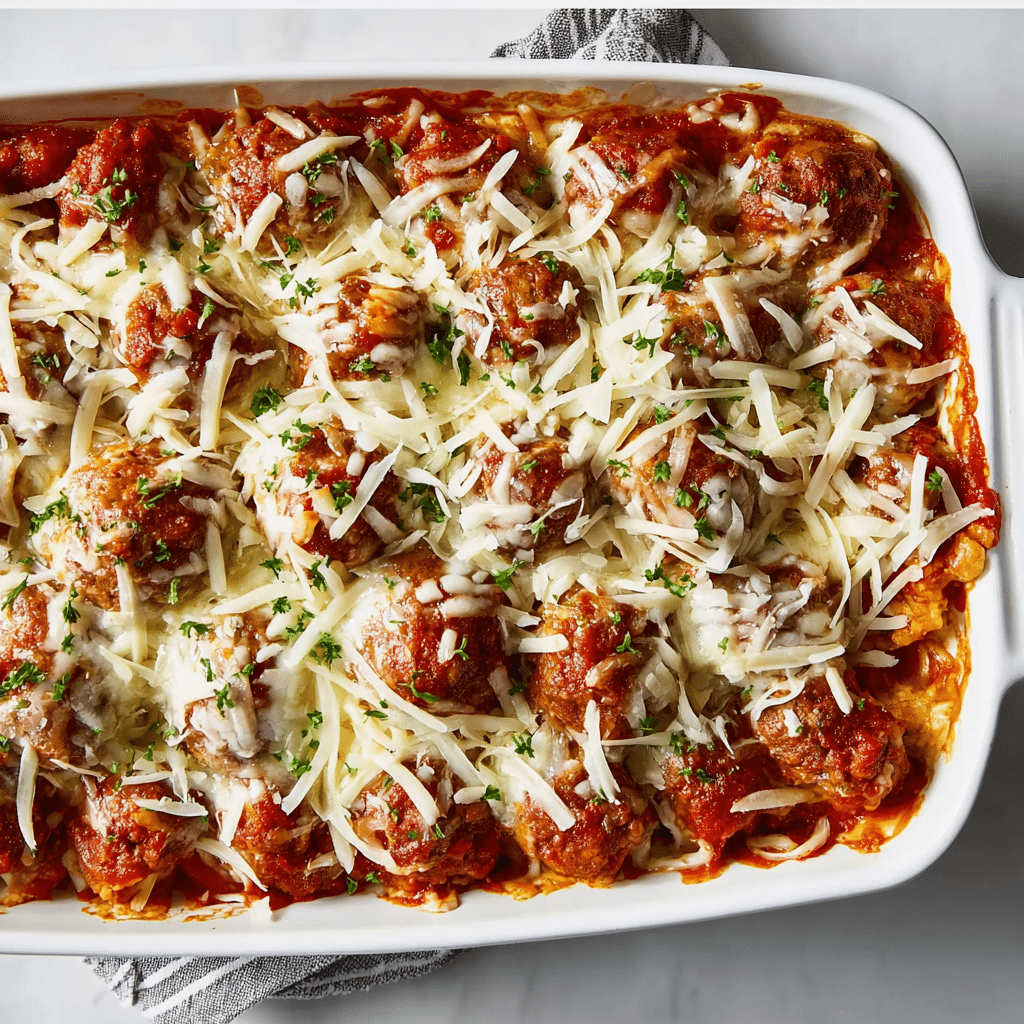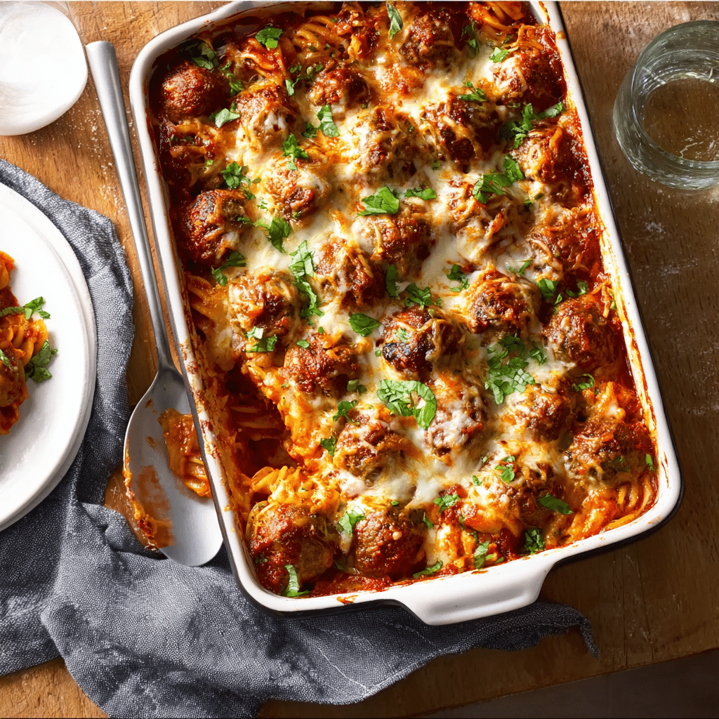Use frozen pre-cooked meatballs for a quick shortcut.Swap ground turkey or chicken for a lighter version.Add sautéed mushrooms, spinach, or bell peppers for extra vegetables.For extra richness, stir a spoonful of ricotta into the pasta mixture.Cover loosely with foil if cheese browns too quickly.