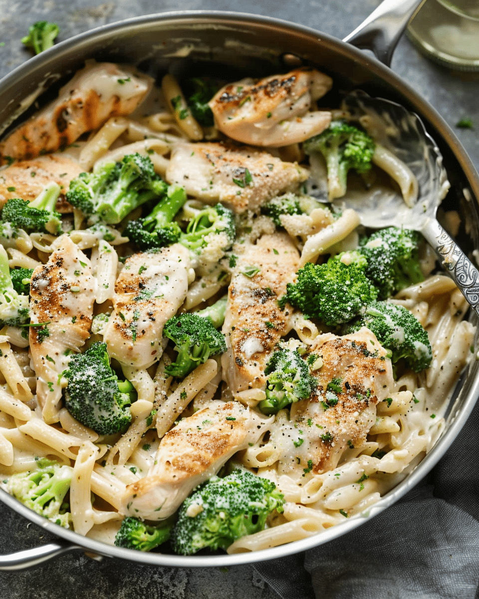 Use rotisserie or pre-cooked chicken to save time.Frozen broccoli can be used—just thaw and drain well before adding.Add mushrooms or spinach for extra veggies and flavor.Swap heavy cream with half-and-half or a mix of milk and cream cheese for a lighter version.To reheat, add a splash of milk or cream and warm gently to keep the sauce creamy.