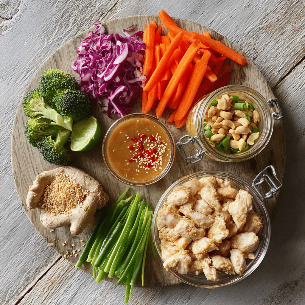 (Tip: You’ll find the full list of ingredients and measurements in the recipe card below.) chicken breast or thighs olive oil garlic, minced salt black pepper paprika cooked rice, quinoa, or brown rice lettuce or mixed greens cucumber, sliced carrots, shredded avocado, sliced cherry tomatoes red cabbage, shredded peanut butter soy sauce lime juice honey or maple syrup coconut milk or water fresh cilantro (optional) crushed peanuts (optional)