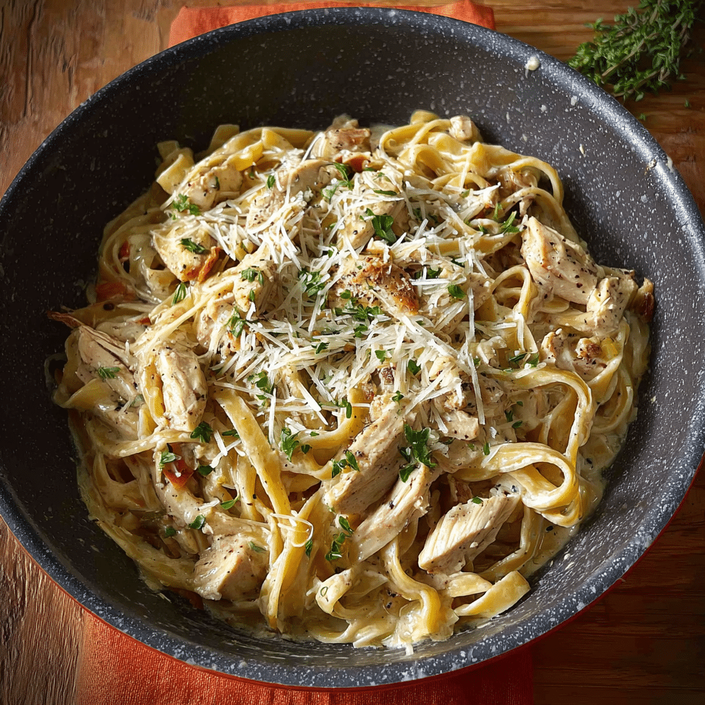 This dish is quick, satisfying, and full of flavor. The creamy sauce coats every strand of pasta, while the chicken adds protein and heartiness. It’s a versatile recipe that can be easily customized and is always a crowd-pleaser.