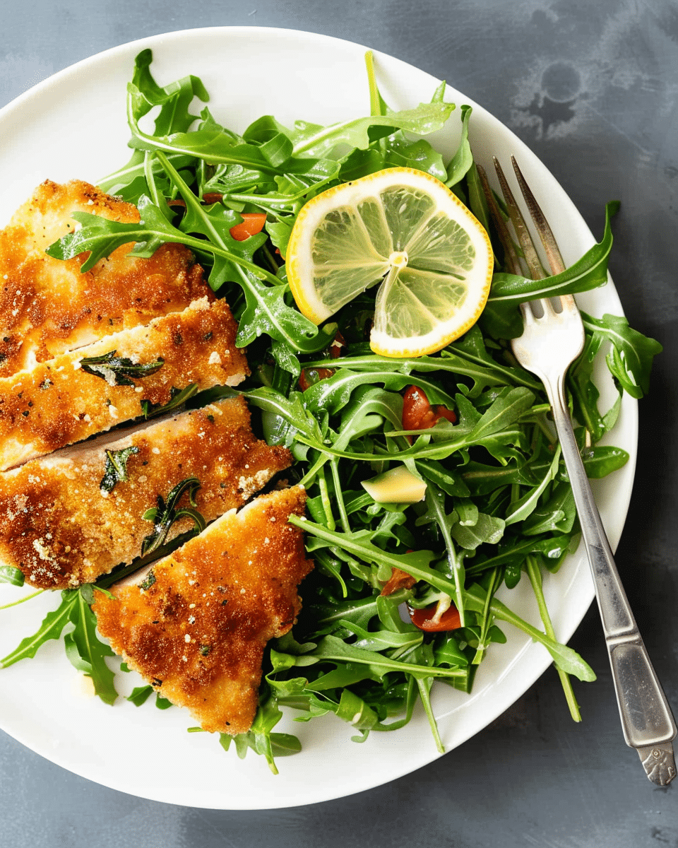 For extra crispiness, use panko breadcrumbs instead of traditional ones.You can prepare and refrigerate the breaded chicken in advance to cook later.Let breaded chicken rest for 5–10 minutes before frying to help the coating stick.Serve with lemon wedges for added brightness.The salad can be customized with avocado, balsamic glaze, or different greens.