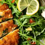 Chicken Milanese with Arugula Salad is a crispy Italian-style breaded chicken cutlet served with a fresh, lemony arugula and tomato salad. It’s a simple yet elegant meal that combines rich, golden chicken with bright, peppery greens.