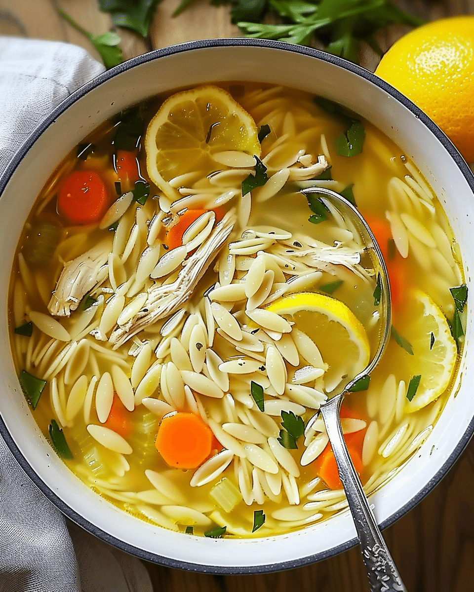 Chicken, Orzo, and Lemon Soup is a comforting, flavorful dish that combines tender chicken, delicate orzo pasta, and a bright, zesty lemon broth. The soup is rich in flavor but light enough to be refreshing, making it perfect for any time of year. With a balance of savory chicken, the creaminess of orzo, and the refreshing kick of lemon, this soup is sure to warm you up and satisfy your taste buds in every spoonful.