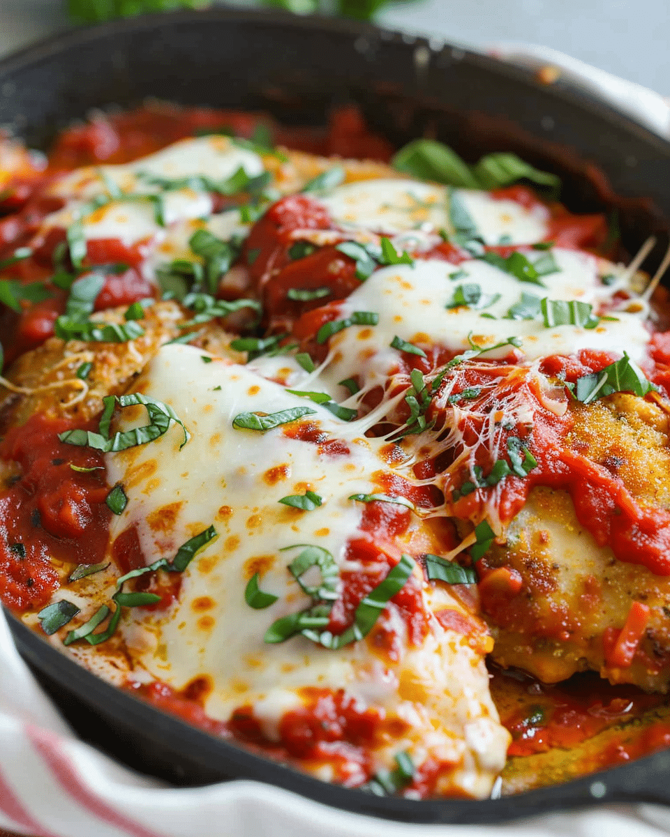 Baked only: Skip frying and bake breaded chicken at 425°F (220°C) for 20–25 minutes before topping with sauce and cheese.