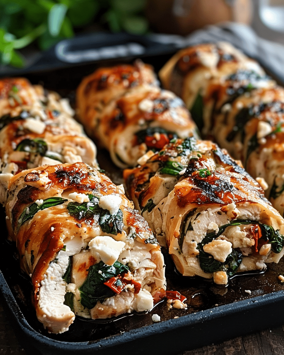 Chicken Rolls with Feta, Spinach & Sun-Dried Tomatoes is a flavorful and satisfying dish that’s perfect for a quick dinner or special occasion. With a delicious filling of creamy feta, fresh spinach, and tangy sun-dried tomatoes, wrapped in juicy, tender chicken, this dish is sure to be a crowd-pleaser. It’s easy to prepare, looks impressive, and pairs wonderfully with a side salad, roasted vegetables, or rice. Whether you’re cooking for your family or hosting guests, these chicken rolls will always deliver on taste and presentation.