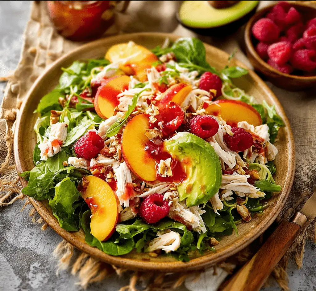 This Chicken Salad with Peaches, Avocado & Fresh Raspberry Dressing is a vibrant, refreshing dish combining juicy peaches, tender chicken, creamy avocado, and a tangy homemade raspberry dressing. Perfect for light lunches or elegant dinners, this salad is bursting with fresh, balanced flavors.