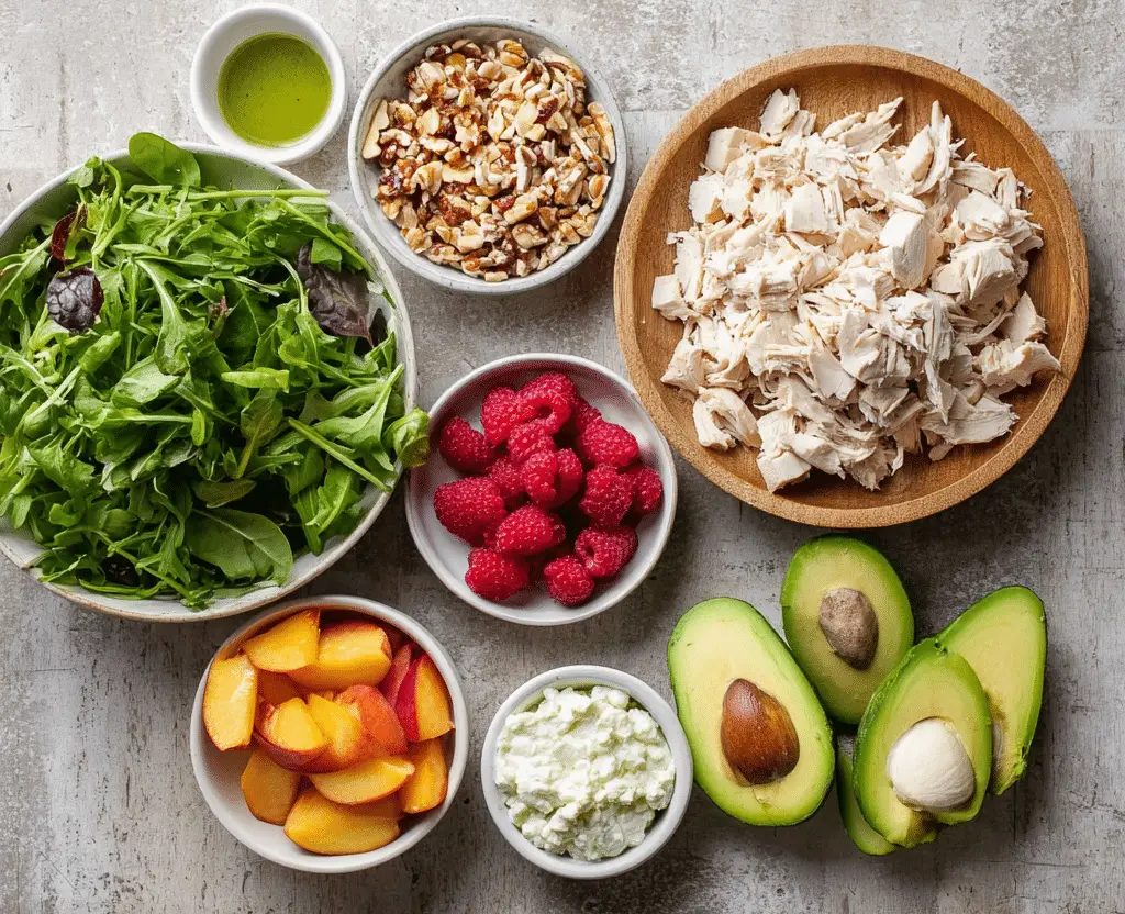 cooked chicken breast, sliced or shredded fresh peaches, sliced avocado, sliced mixed greens red onion, thinly sliced fresh raspberries crumbled cheese such as feta or goat cheese nuts such as almonds or pecans