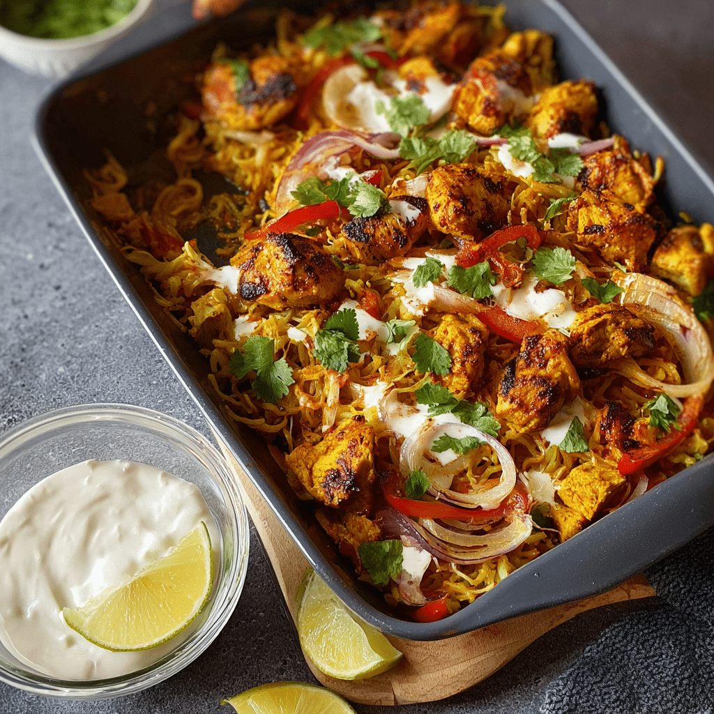 You can use paneer or tofu instead of chicken for a vegetarian version. Add potatoes or cauliflower for a heartier tray bake. For extra smokiness, finish under the broiler for a few minutes. Serve with naan, rice, or a cooling yogurt sauce for a complete meal.