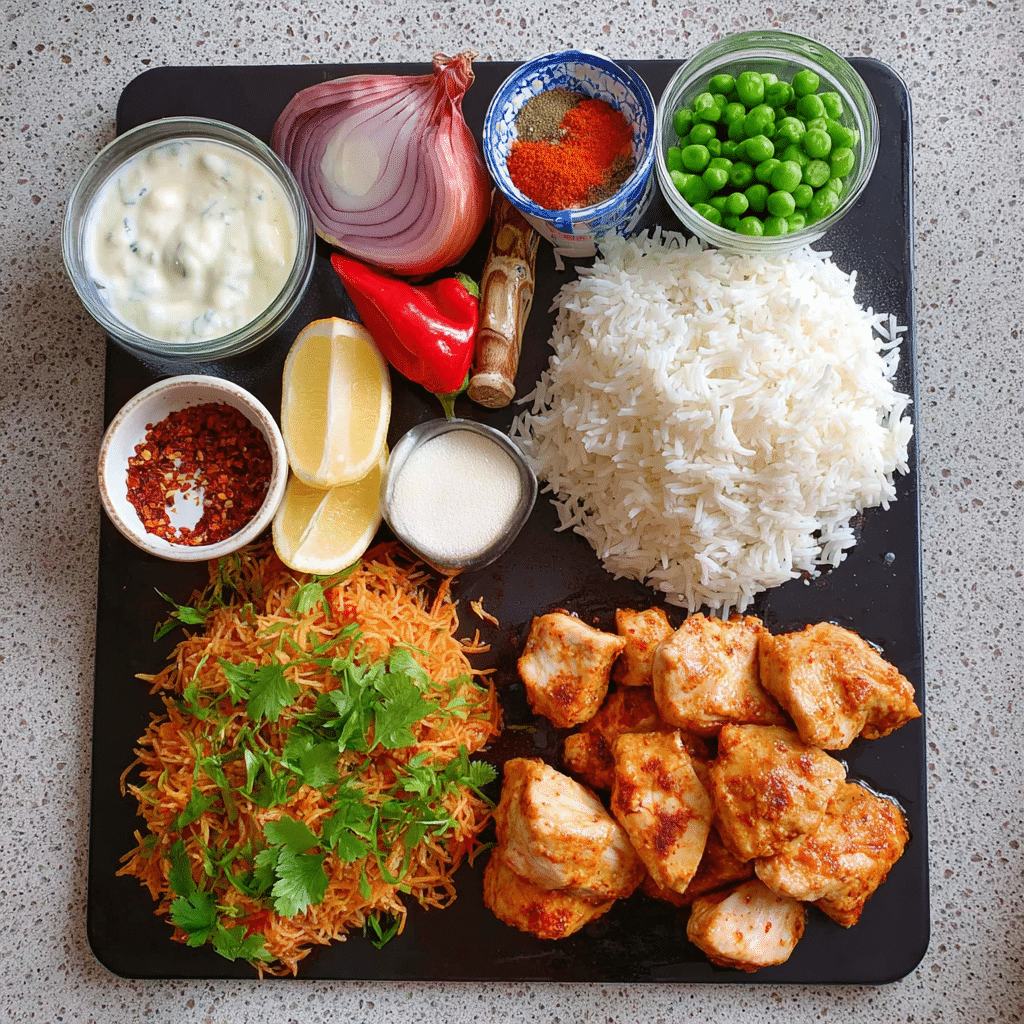 (Tip: You’ll find the full list of ingredients and measurements in the recipe card below.) chicken thighs or breast, cut into chunks plain yogurt garlic, minced fresh ginger, grated lemon juice tomato paste garam masala paprika ground cumin ground coriander turmeric chili powder (optional) salt black pepper olive oil red onion, sliced bell peppers, sliced zucchini or other vegetables of choice fresh cilantro (for garnish)