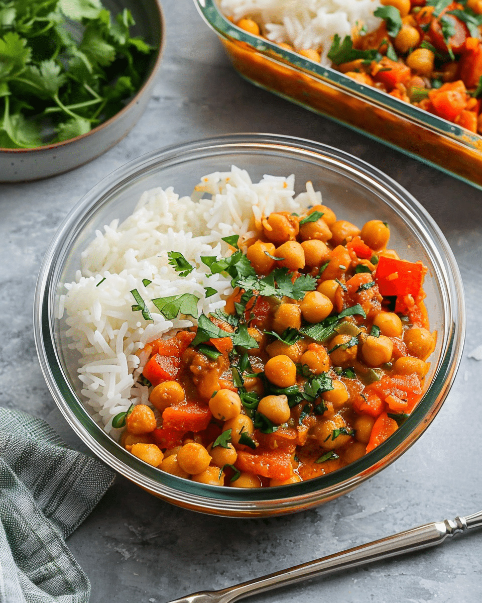 Chickpea Curry Meal Prep Bowls are flavorful, plant-based meals featuring protein-rich chickpeas in a creamy, spiced curry sauce. Perfect for meal prep, they reheat well and pair with rice or quinoa for a satisfying, nutritious lunch or dinner.