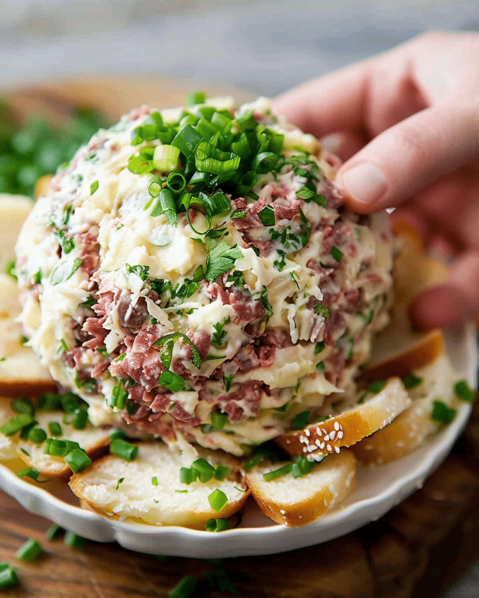 Coat Cheese Ball: Unwrap the cheese ball and roll it in the reserved chopped dried beef and green onions to coat evenly.