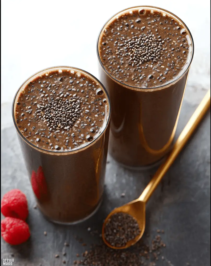 Chocolate Chia Smoothie is a creamy, nutritious drink made with cocoa, chia seeds, and natural sweeteners. It offers rich chocolate flavor while providing fiber, omega-3s, and energy — perfect for breakfast, post-workout, or a healthy dessert.
