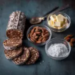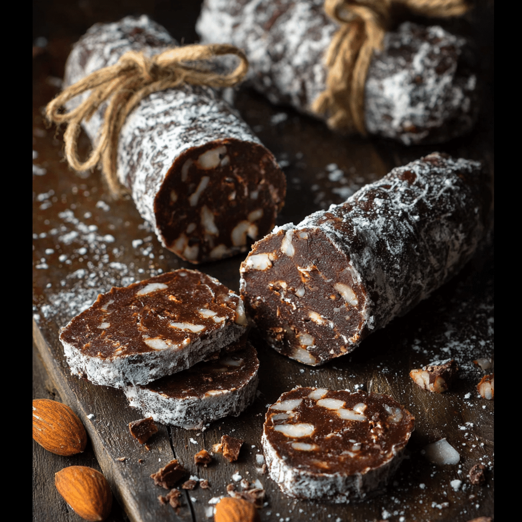 Chocolate salami is a no-bake dessert made from chocolate, crushed biscuits, butter, and nuts, shaped into a log and sliced.