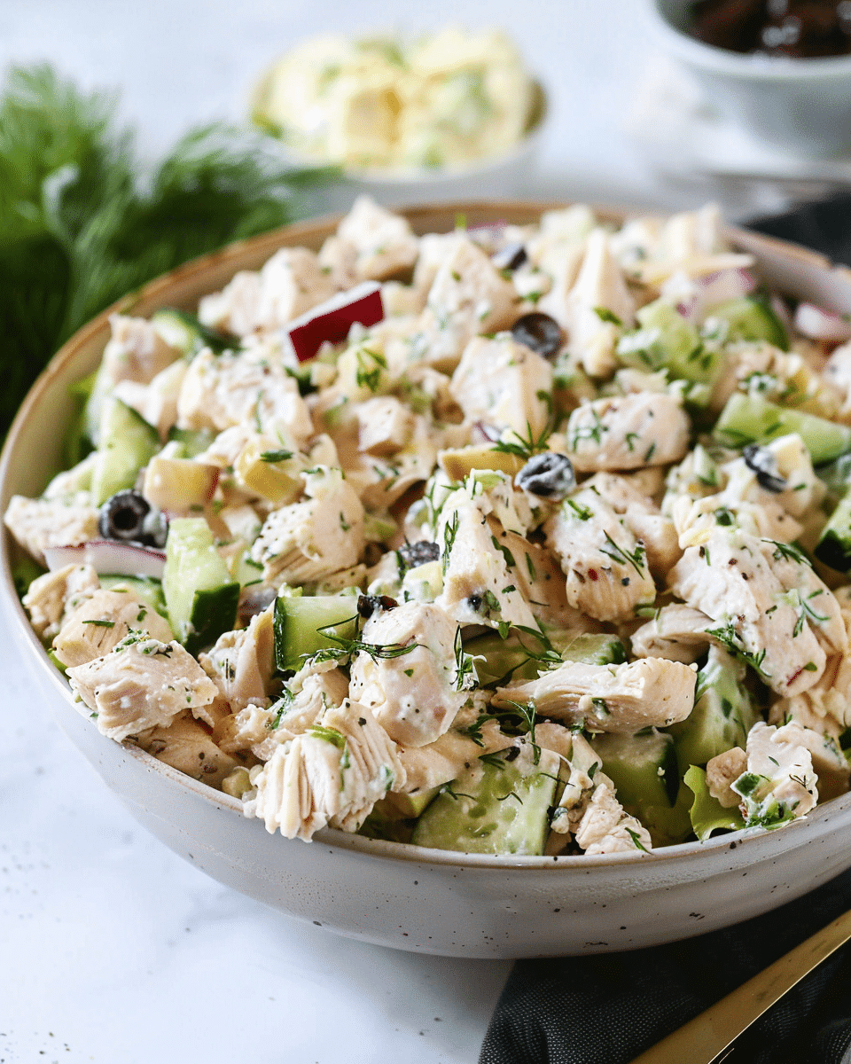 Use Greek yogurt instead of mayo for a lighter version.Add grapes, apples, or dried cranberries for a sweet twist.Mix in toasted nuts like almonds or walnuts for crunch.Flavor variations include curry powder, paprika, or fresh dill.Stir before serving if stored, as dressing may separate.