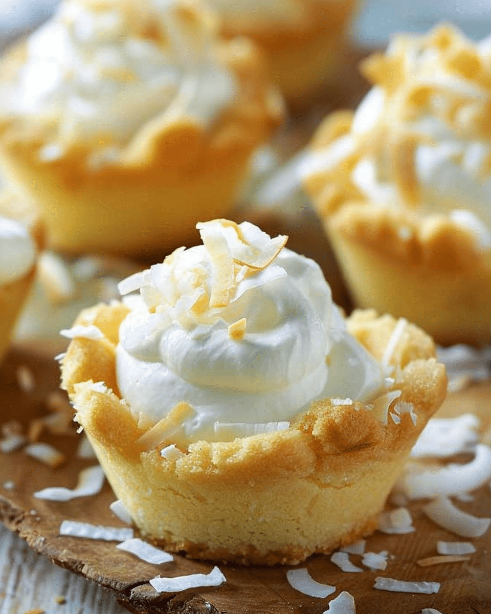 Use store-bought sugar cookie dough for a shortcut.For less sweetness, substitute unsweetened shredded coconut.Cookie cups can be baked ahead and frozen (unfilled) for up to 2 months.Toasting coconut enhances flavor and adds texture—toast in a dry skillet over medium heat until golden.For a richer filling, replace pudding with homemade coconut pastry cream.