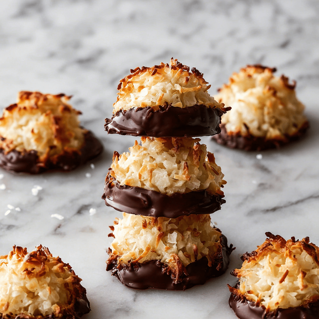 Coconut Macaroons are sweet, chewy cookies made with shredded coconut, egg whites, and sugar, creating a crisp golden exterior and a soft, moist center. These classic coconut macaroons are naturally gluten-free, easy to prepare, and perfect for holidays, dessert trays, or quick homemade treats. With their rich coconut flavor and simple ingredients, they are a timeless cookie that can be enjoyed plain or dipped in chocolate.