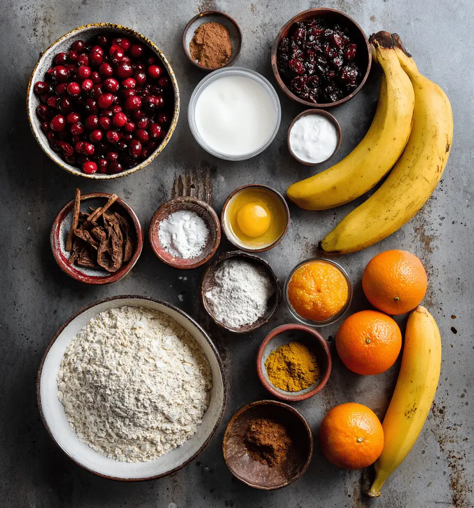 (Tip: You’ll find the full list of ingredients and measurements in the recipe card below.) ripe bananas fresh or dried cranberries orange zest orange juice all-purpose flour granulated sugar brown sugar eggs unsalted butter baking soda salt vanilla extract