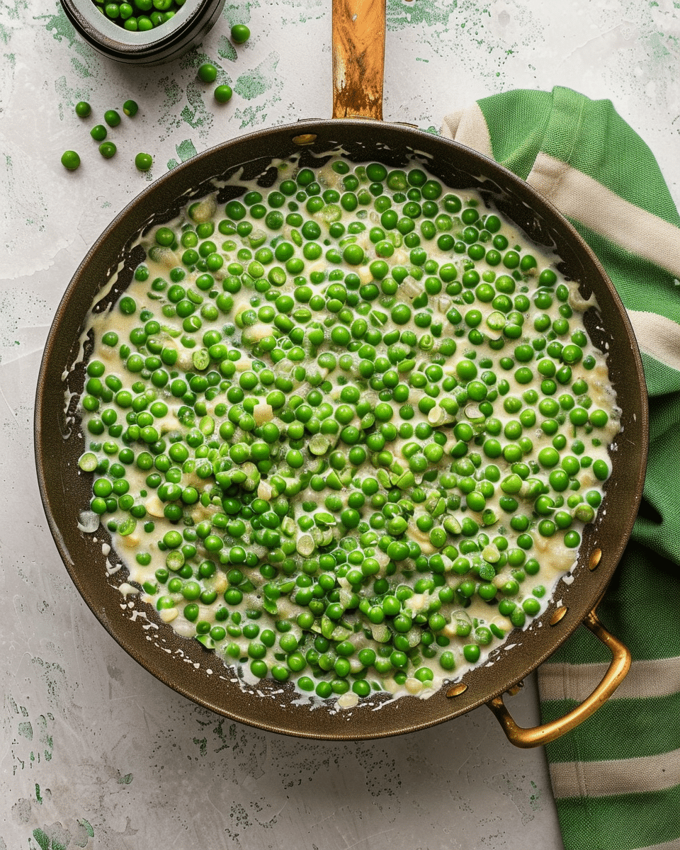 Combine peas with the sauce: Add the cooked peas to the saucepan, stirring gently to coat the peas with the creamy sauce. Cook for an additional 2-3 minutes, allowing the peas to warm up in the sauce.