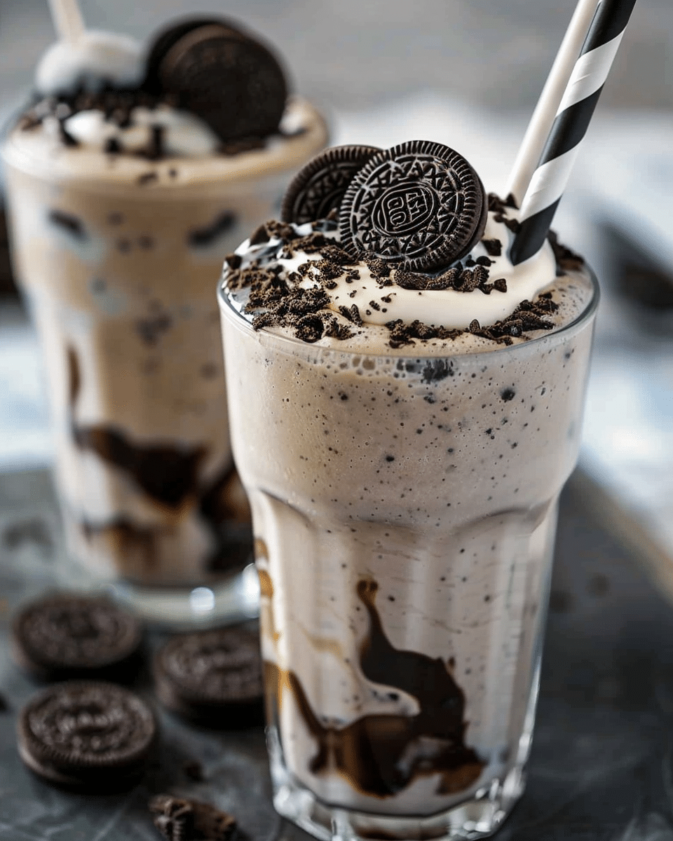 A rich and indulgent Oreo milkshake made by blending crunchy chocolate cookies with creamy vanilla ice cream and milk, topped with whipped cream and optional chocolate syrup for the ultimate cookies-and-cream treat.