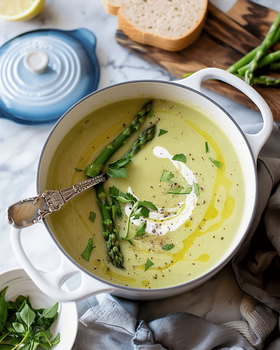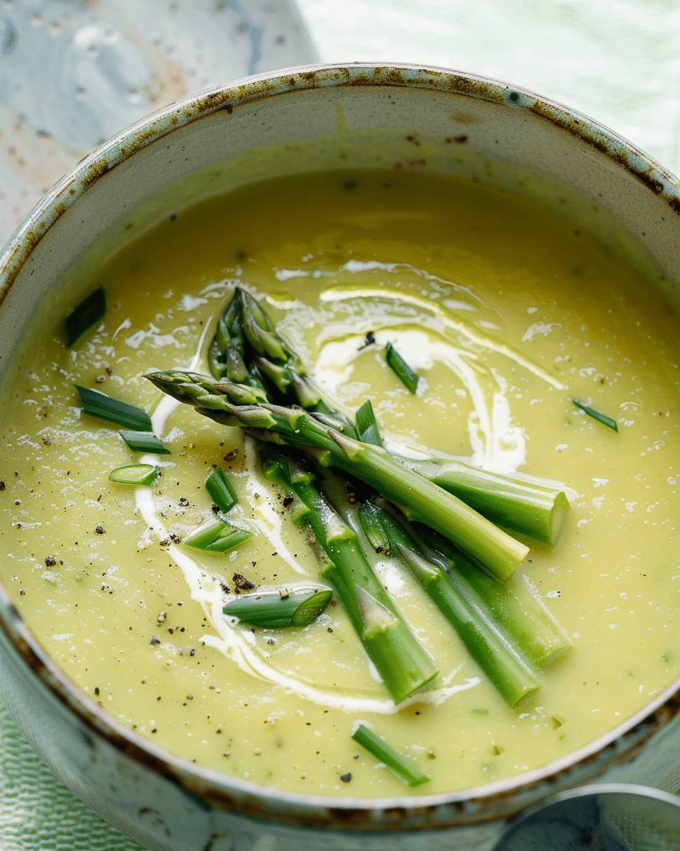 Add a diced potato while cooking for added creaminess without more dairy.Skip cream for a lighter version or use yogurt or sour cream instead.Garnish with blanched asparagus tips, fresh herbs, or a swirl of cream for presentation.To serve chilled, cool soup completely and refrigerate for several hours before serving.Pairs well with crusty bread or a green salad.