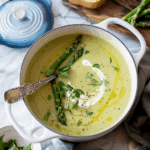 Storage: Let the soup cool to room temperature, then transfer to an airtight container and store in the refrigerator for up to 3‑4 days. Freezing: You can freeze this soup, though texture may change slightly (creaminess may separate). Thaw overnight in the fridge and reheat gently. For best results, you may want to leave out garnish and add fresh herbs or asparagus tips after reheating. Reheating: Reheat gently on the stovetop over low to medium‑low heat, stirring occasionally. If the soup has thickened too much, add a bit of broth or water to loosen it. Avoid boiling vigorously once cream is added.