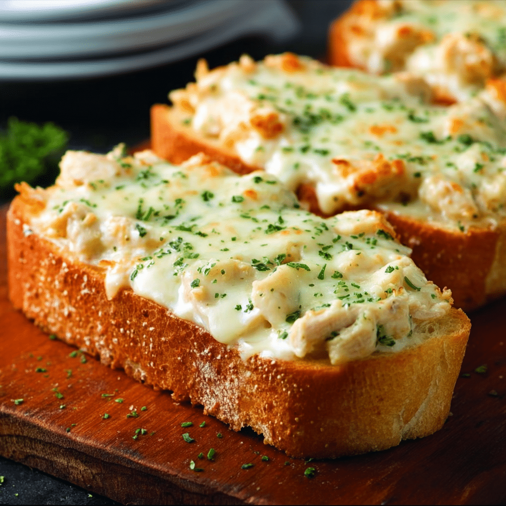 This recipe brings together two favorites—garlic bread and creamy Alfredo pasta—into one irresistible dish. It’s quick to prepare, incredibly flavorful, and perfect for using up leftover chicken. The crispy bread contrasts beautifully with the creamy topping, making every bite satisfying. Whether for a casual dinner or a party snack, it’s always a hit.
