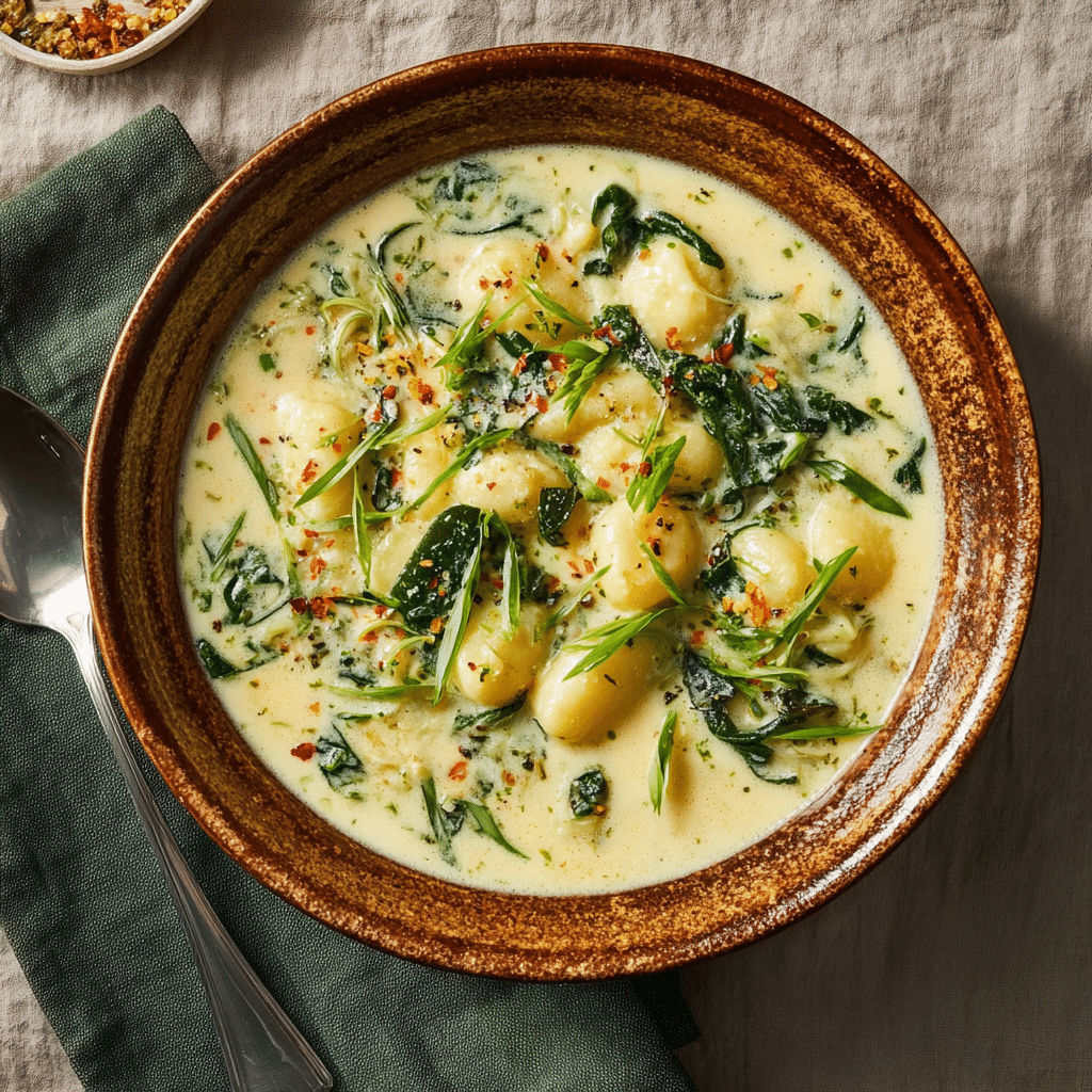 A rich, cozy soup featuring tender potato gnocchi in a creamy, herb-infused broth with vegetables. Perfect for weeknight dinners or chilly evenings.
