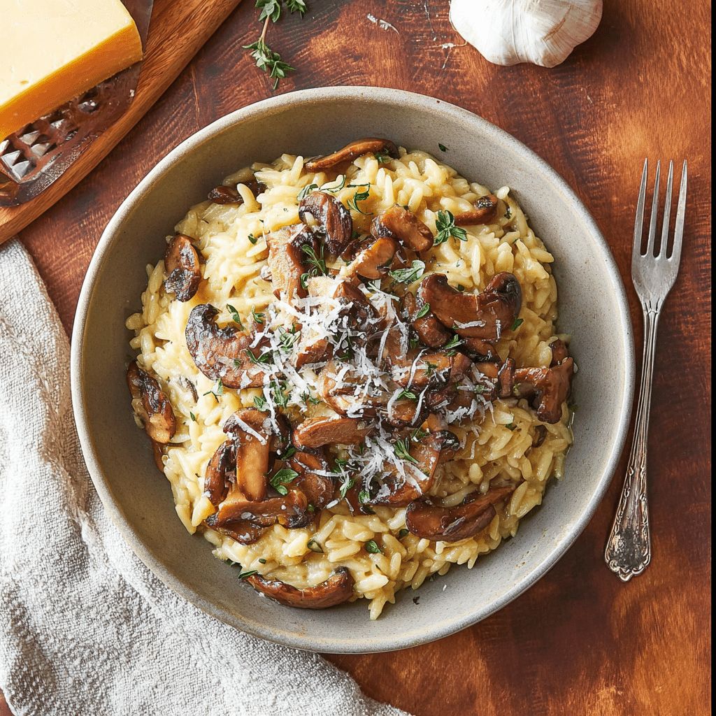 orzo pasta mushrooms (such as cremini, button, or a mix) olive oil butter onion or shallot garlic vegetable or chicken broth parmesan cheese heavy cream or milk salt black pepper fresh thyme or parsley