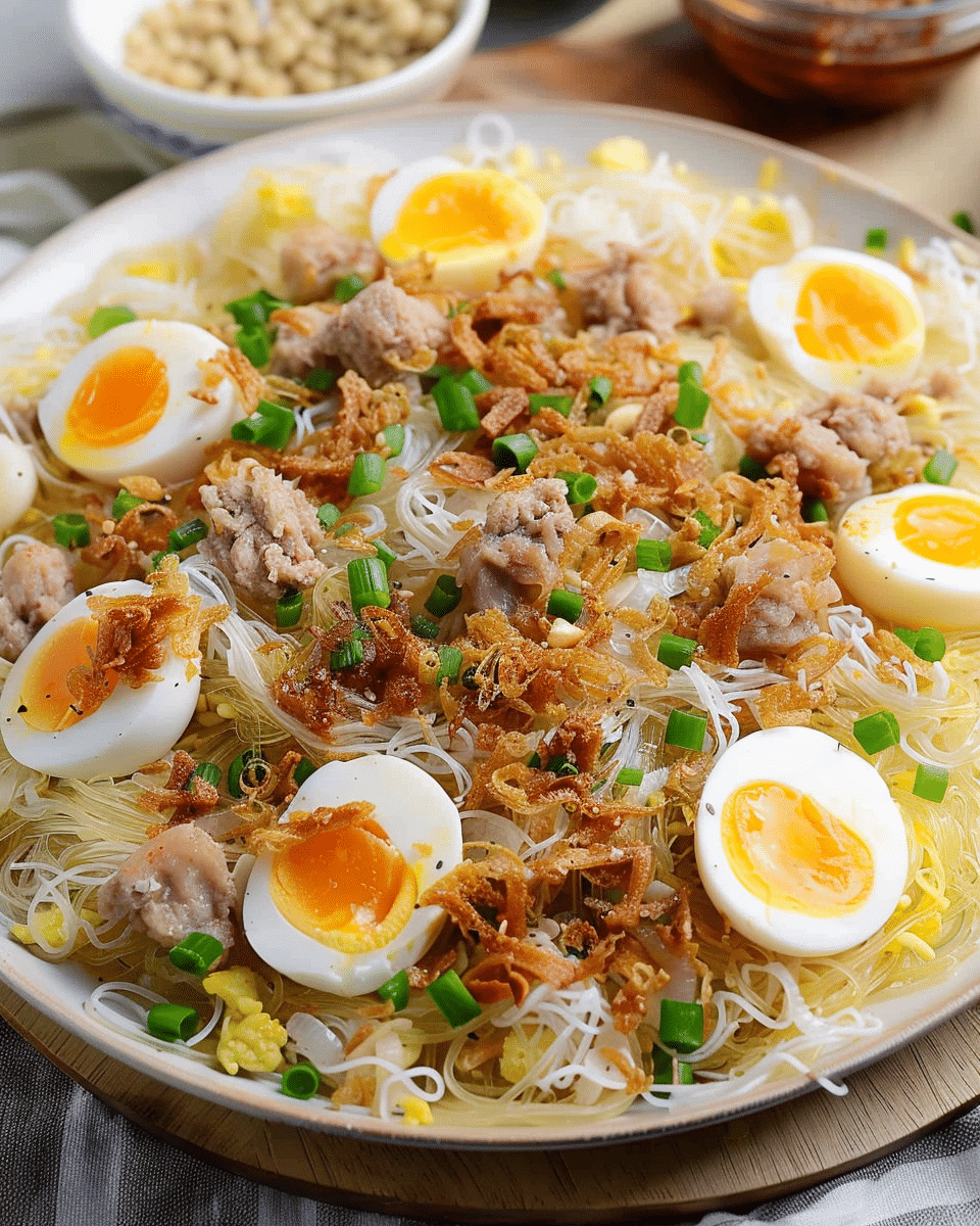 Creamy Palabok is a rich and comforting Filipino noodle dish made with rice noodles topped with a seafood-and-flavored orange-hued sauce, and garnished with hard-boiled eggs, smoked fish flakes, chicharrón, and scallions. It’s a festive, umami-packed recipe perfect for gatherings or special meals.