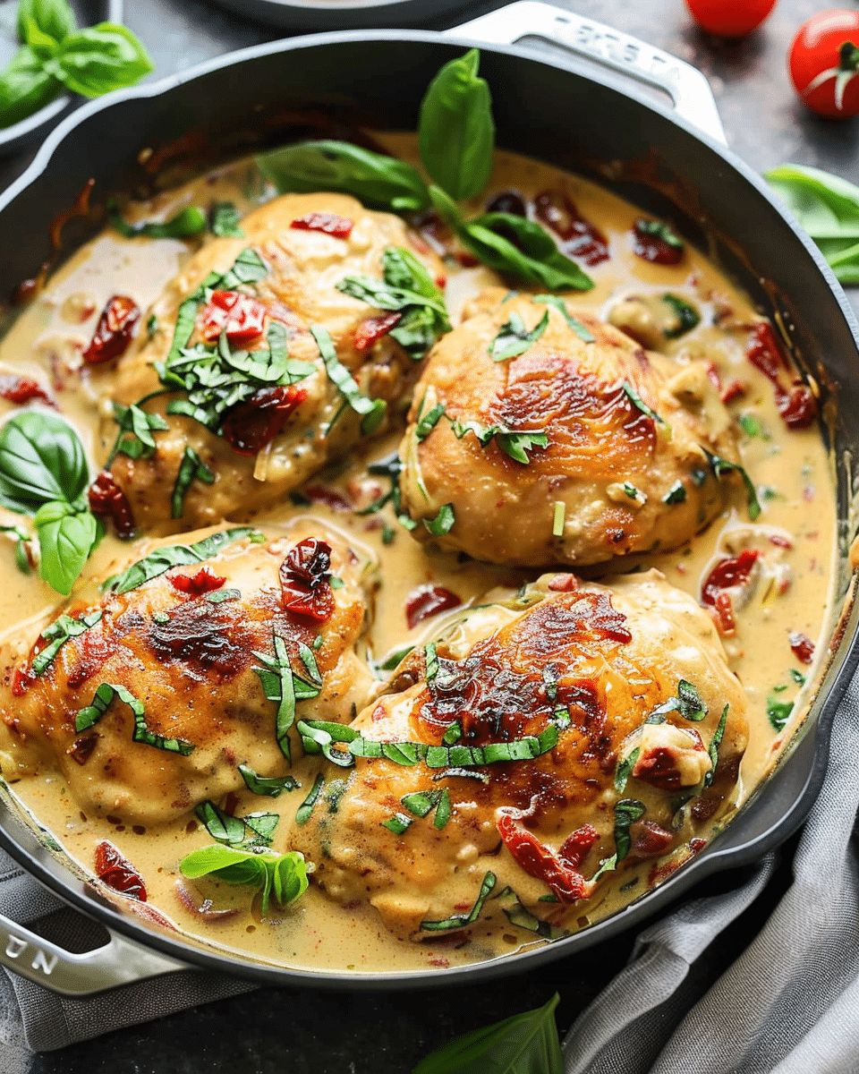 Creamy Sun-Dried Tomato Chicken is a quick and elegant dish featuring tender chicken breasts simmered in a rich parmesan cream sauce with garlic, herbs, and sun-dried tomatoes. It’s perfect for weeknight dinners or special occasions.
