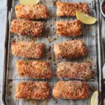 Use gluten-free flour and breadcrumbs for a gluten-free option.For extra flavor, add Parmesan or dried herbs to the breadcrumb mix.Freeze uncooked, breaded fish sticks for up to 2 months. Bake from frozen, adding a few extra minutes.Reheat leftovers in an oven or air fryer for best crispiness. Avoid microwaving.Substitute with cod or halibut if preferred.